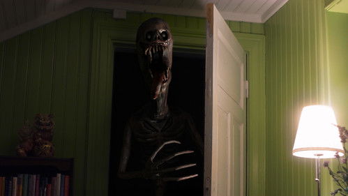 A man peacefully sips his coffee, engrossed in a book, until a door suddenly swings open, revealing a dimly lit room.
