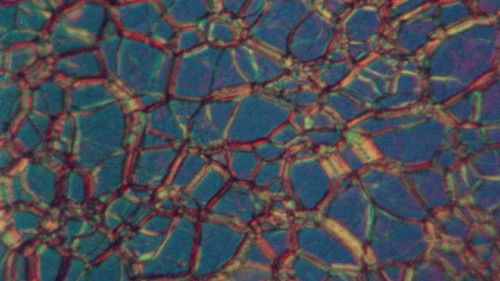 Title cards introduce images we watch without narration; they are displays of shape and color. François de Roubaix's electronic music accompanies these images, photographed under a polarizing microscope. The crystals appear to move like tiny organisms: small four-part fans share the frame with flowing lines of pink. Multiple patterns appear side by side.