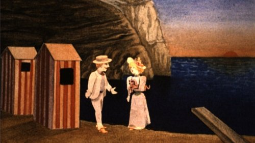 The film consists of a series of animations on a beach containing two beach huts and a diving board. Two characters play at diving into the water from the diving board and then appear on the beach. The woman begins to play with a small dog and is then joined by a gentleman. The two play around on the beach before getting changed into bathing costumes and going into the water. They bob up and down in the water before swimming out of the scene. Once the couple have gone a man sails out in a boat.