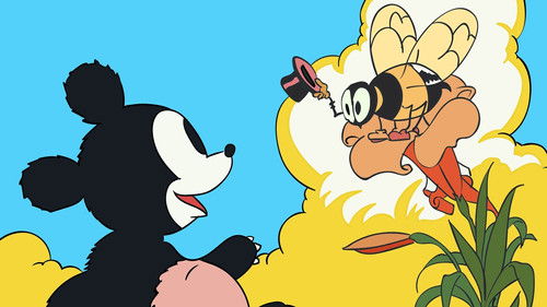 Two bear cubs tussle harmlessly, then start to munch on a berry bush, until a bigger, meaner bear chases them off. They nibble some flowers and find a bee, which they follow to the hive, which they then proceed to raid. The big bear chases them off, but unknown to him, a bee spotted the raid and has summoned the attack squad. The bees run him off, and the cubs dig in.
