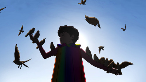 Arco, ten years old, lives in a far future. During his first flight in his rainbow suit, he loses control and falls in the past. Iris, a little girl his age from 2075, saw him fall. She rescues him and tries by all means to send him back to his era.